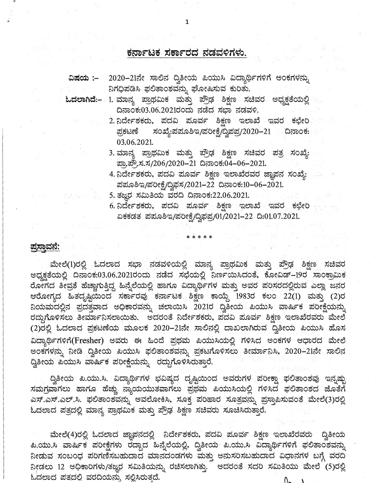 Subject: Setting marks for second PUC students for the year 2020-21 and announcing the result