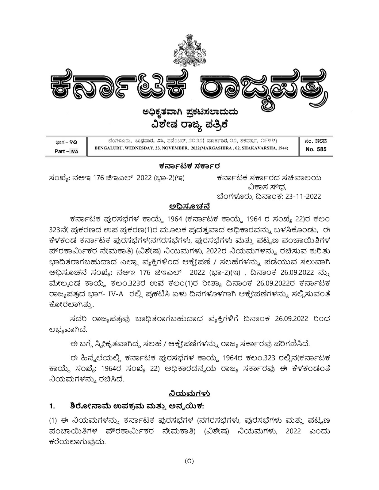 Subject: Karnataka Municipalities (Recruitment of Pourakarmikas in City Municipal Councils, Town Municipal Councils and Town Panchayats) (Special) Rules, 2022