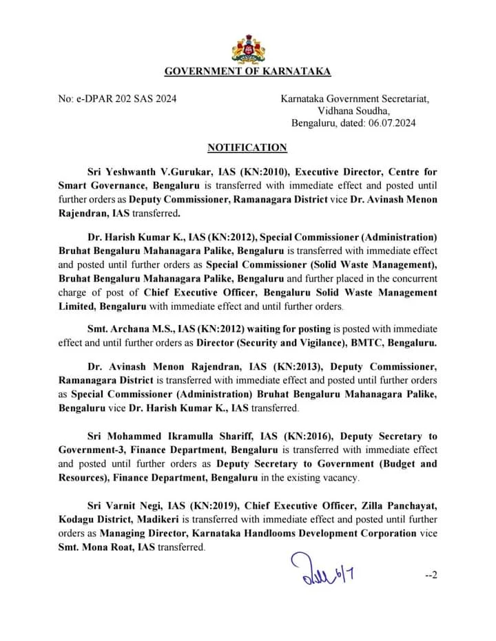 ಸ್ಥಳ ನಿಯುಕ್ತಿಯ ನಿರೀಕ್ಷೆಯಲ್ಲಿ ಅರ್ಚನಾ ಎಂ ಎಸ್ ಬಿಎಂಟಿಸಿ (ಭದ್ರತೆ & ಸುರಕ್ಷತೆ) ನಿರ್ದೇಶಕರಾಗಿ ನೇಮಕ ಗೊಂಡಿದ್ದಾರೆ. ರಾಮನಗರ ಜಿಲ್ಲಾಧಿಕಾರಿಯಾಗಿದ್ದ ಅವಿನಾಶ್ ಮೆನನ್ ಬಿಬಿಎಂಪಿ ಆಡಳಿತ ಸ್ಪೆಷಲ್ ಕಮಿಷನರ್ ಆಗಿ ನೇಮಕಗೊಂಡಿದ್ದಾರೆ. ಈ ಹಿಂದೆ ಯಶವಂತ್ ವಿ ಗುರುಕರ್ ಕಲಬುರುಗಿಯಲ್ಲಿ ಸೇವೆ ಸಲ್ಲಿಸಿದ್ದರು.